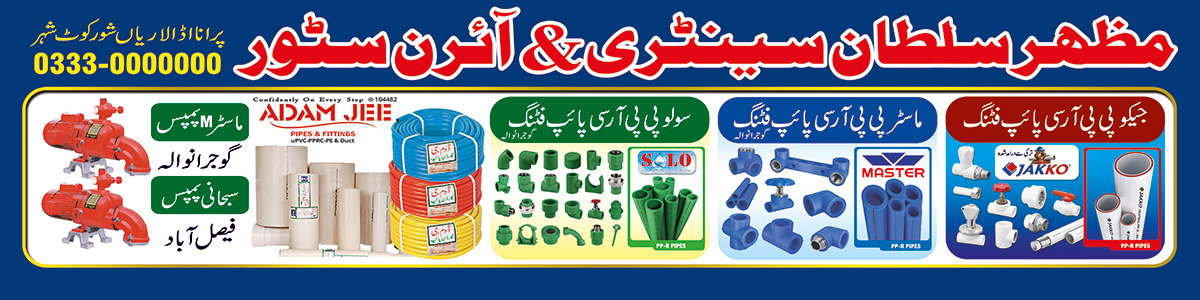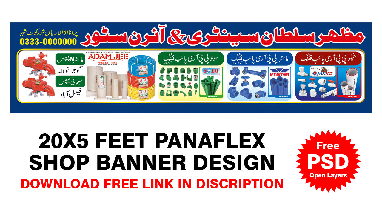 20×5 Feet sanitary shop Panaflex banner design Free Photoshop PSD file with open layers, print ready shop banner panaflex design, best for outdoor and indoor banner flex printing. Sanitary and Iron store shop panaflex design in Urdu.